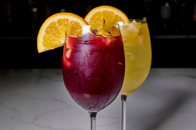 Red: Aperol, cherry brandy, orange juice and grapefruit soda. White: Rum, peach snaps, fresh pineapple juice and grapefruit soda.