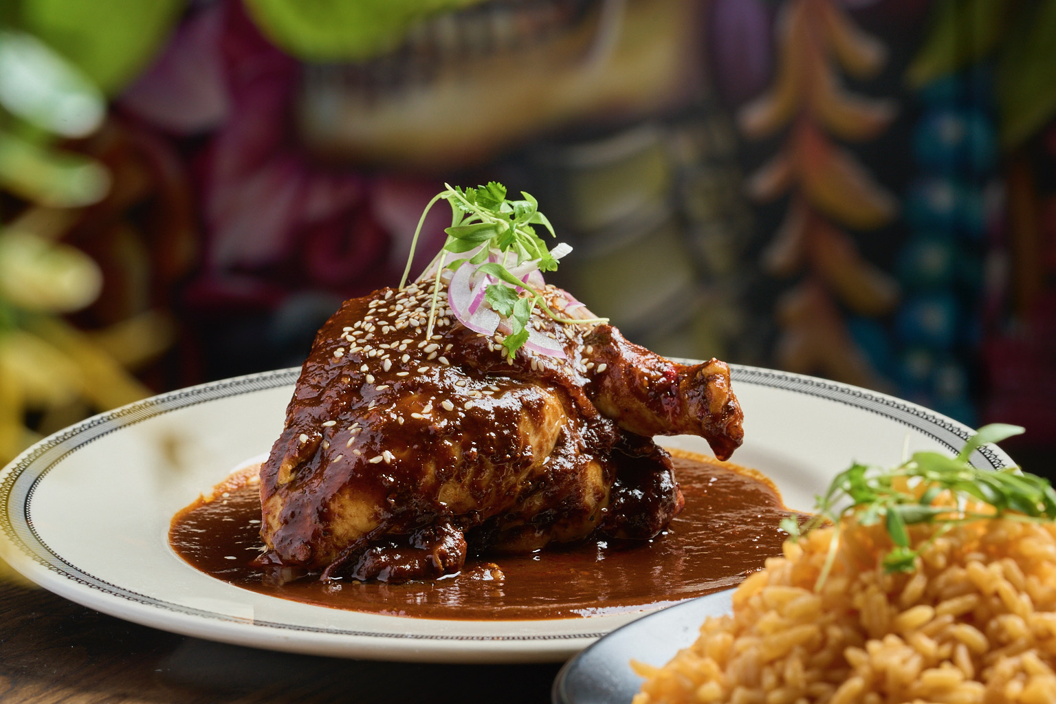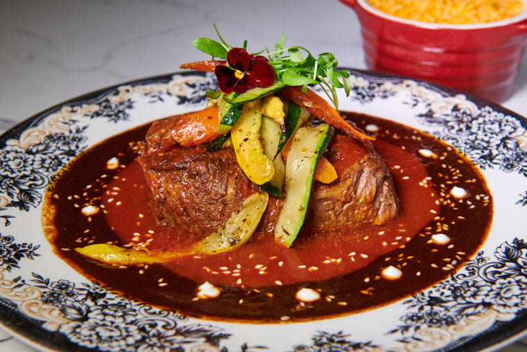 Tender fork braised beef short rib and served with mole poblano and Oaxoqueno, roasted vegetables, sofrito Rice, toasted sesame seeds and crema fresca.