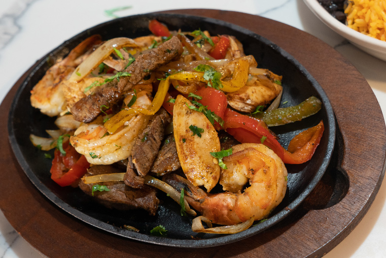 Jumbo shrimps, black angus beef strips and chicken breast strips sautéed with onions, peppers and seasoning with our special fajitas blend season and served with rice, beans, pico de gallo, guacamole and side of tortillas.