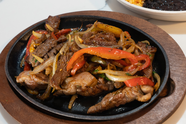 Black angus beef steak strips, sofrito rice, Chihuahua cheese, sweet corn, fried beans, guacamole, pico de gallo, small House salad and choice of spicy salsa.