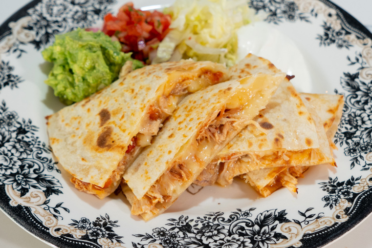Shredded chicken with chihuahua cheese served on flour tortilla with shredded lettuce, pico de gallo, guacamole and cremates fresca.