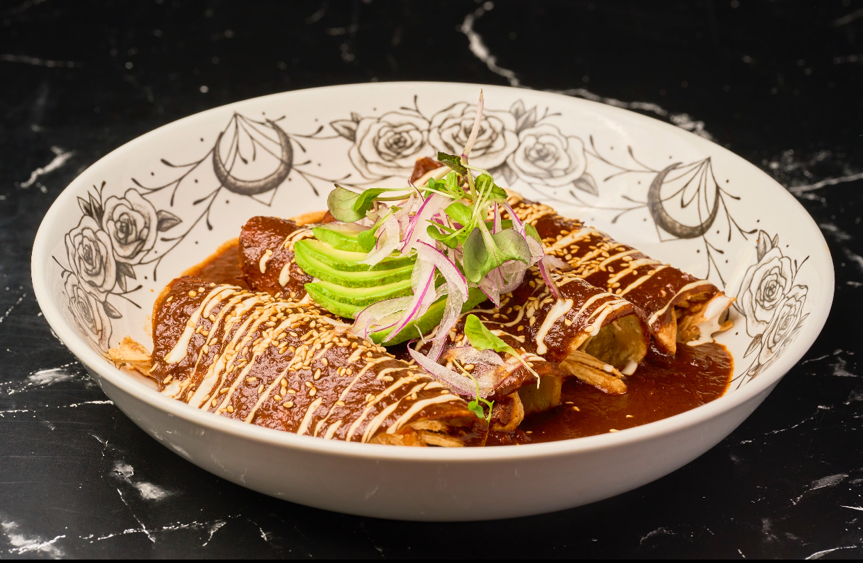 Hand-rolled corn tortillas filled with shredded chicken, topped with our rich house-made mole poblano sauce, toasted sesame seeds, and crema fresca. Served with sofrito rice, refried beans, avocado and shaved red onions.