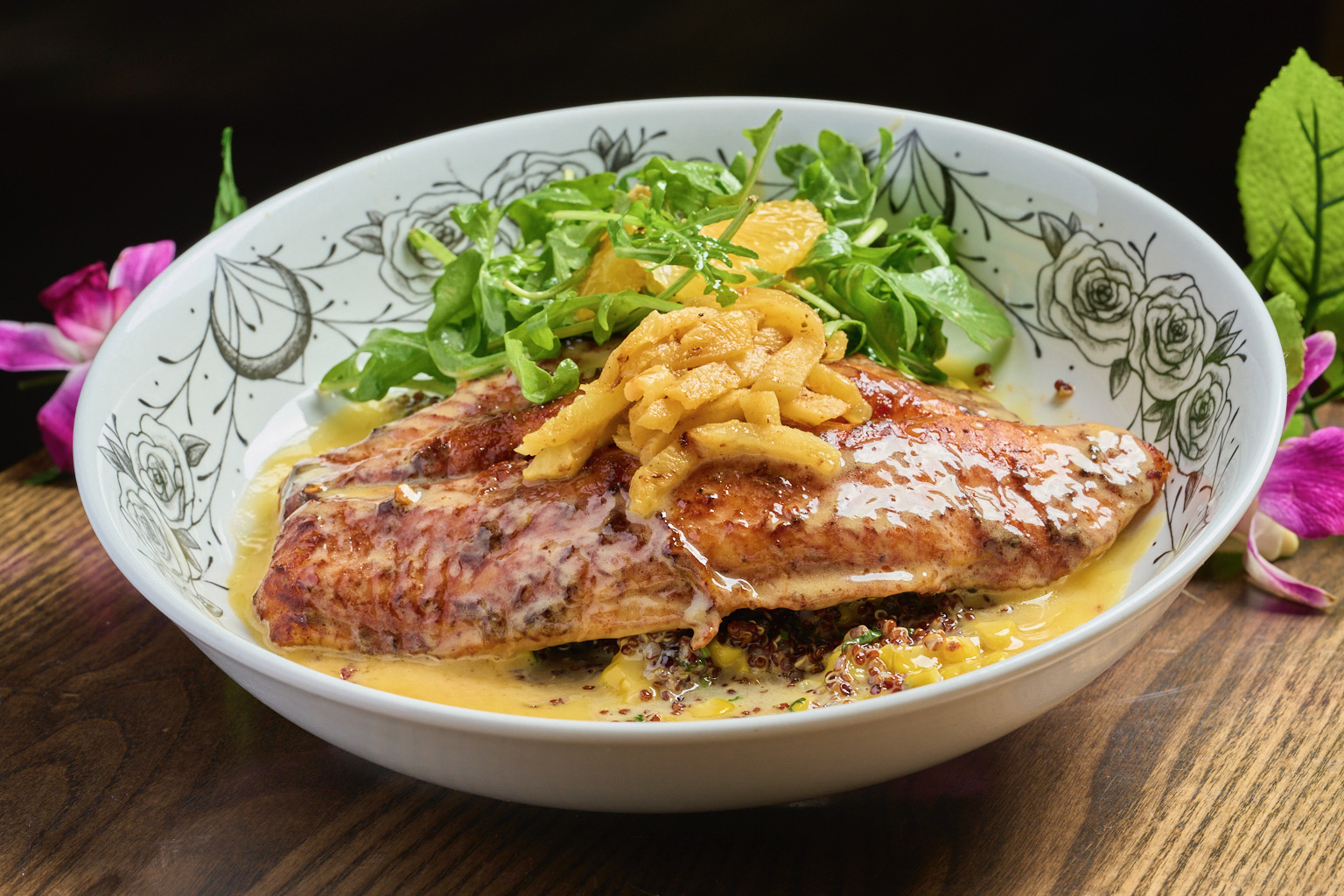 Pan-seared Atlantic flounder marinated in our signature al pastor sauce with guajillo, pineapple, and achiote, served with organic red quinoa, corn esquires. Finished with a orange beurre blanc.